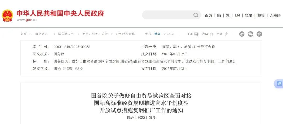 根据通知,此次复制推广的77条试点措施,涵盖服务贸易、货物贸易、数字贸易、知识产权保护、政府采购改革、“边境后”管理制度改革、风险防控等7个方面。其中,加强数字人民币试点应用场景创新、优化跨国公司跨境资金集中运营管理政策、制定数据出境负面清单、推动电子提单等电子单据应用、健全协调劳动关系三方机制等34条措施复制推广至其他自贸试验区;推进电子支付跨境应用、鼓励采信商用密码检测认证结果、实施数据安全管理认证制度、有序推进政务数据开放、提升政府采购平台数字化水平等43条措施复制推广至全国。
