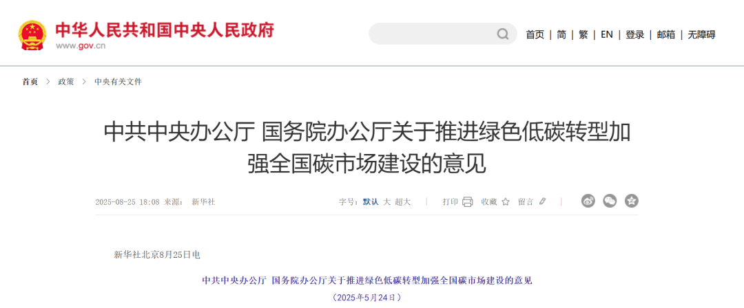 8月25日,中共中央办公厅、国务院办公厅发布《关于推进绿色低碳转型加强全国碳市场建设的意见》,内容包括加快建设全国碳排放权交易市场、着力提升碳市场活力、全面加强碳市场能力建设等。